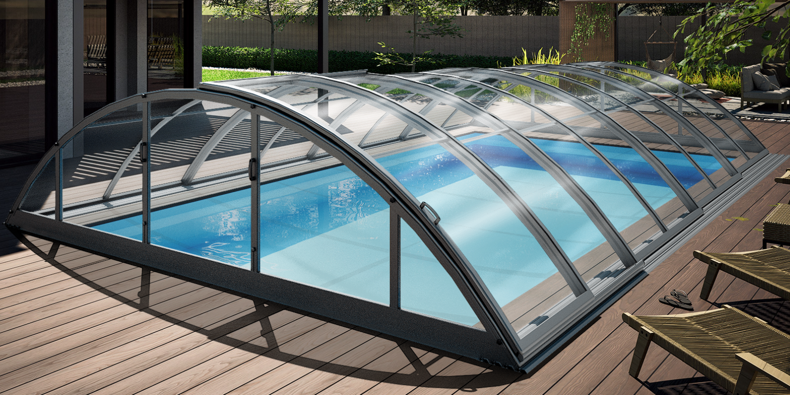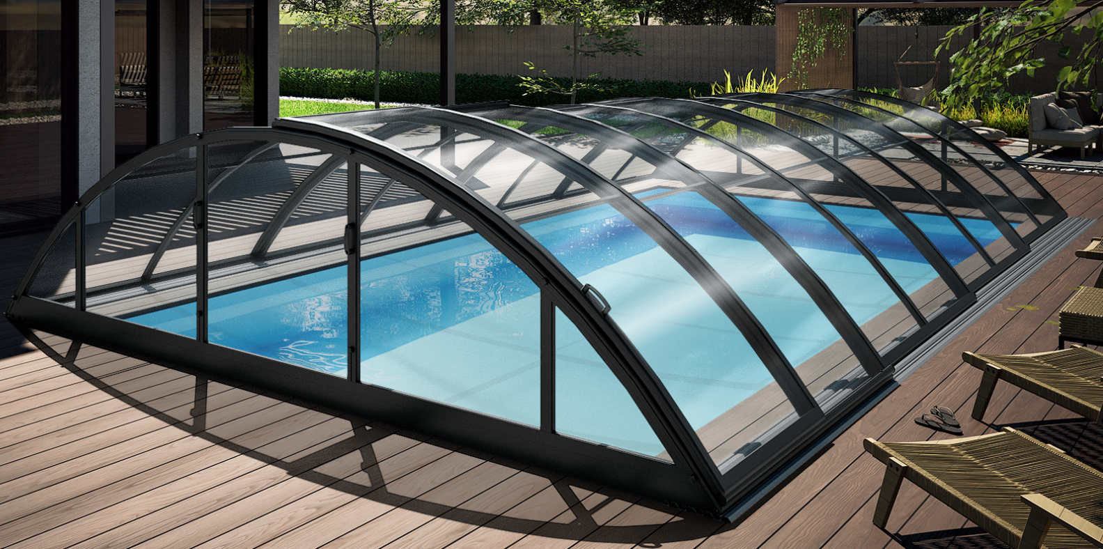 Dette lave pooltak kombinerer æstetik med funktionalitet gennem sit design med klar glas polykarbonat og antracit pulverlackeret aluminiumprofiler, hvilket skaber en stilren og moderne æstetik. Et...