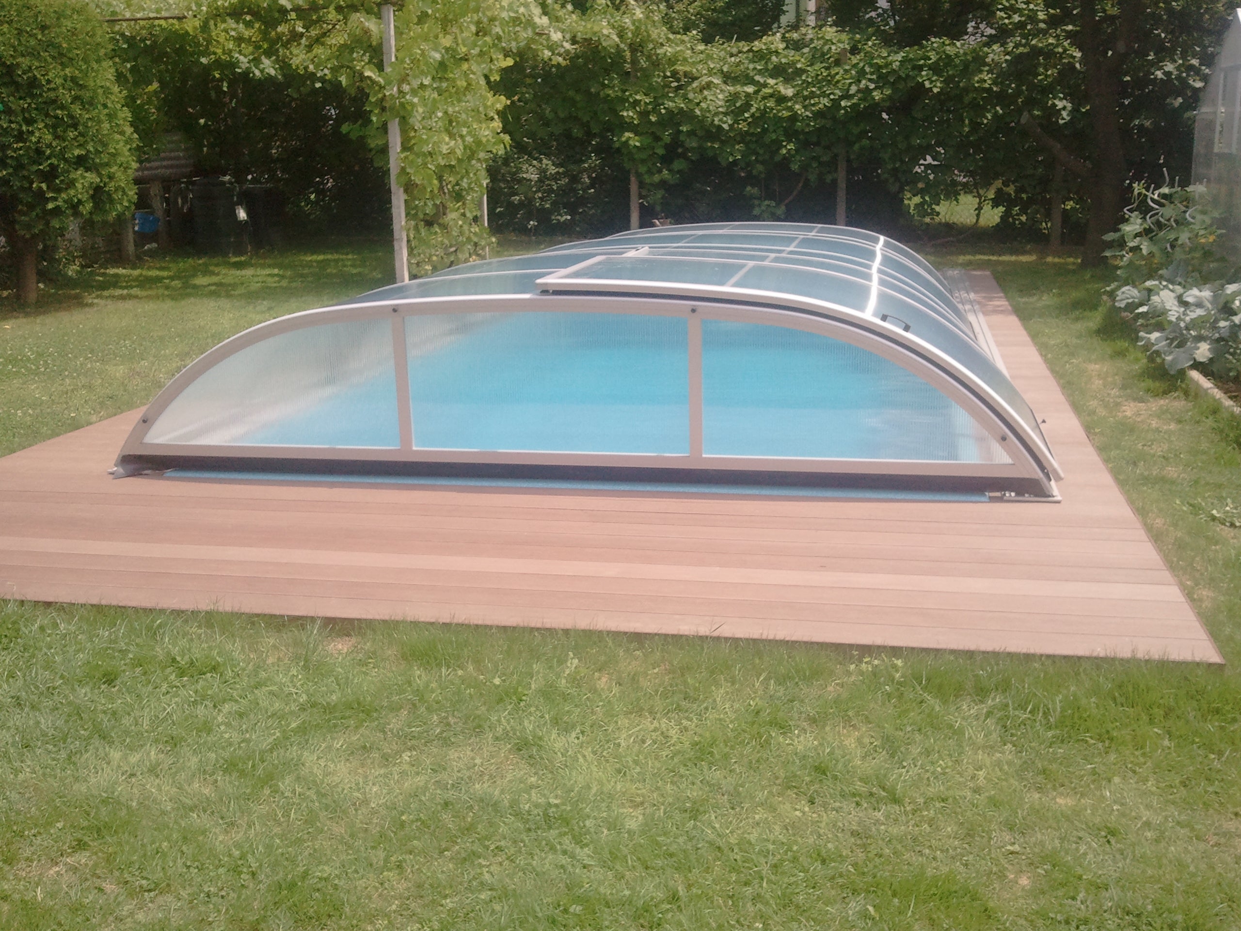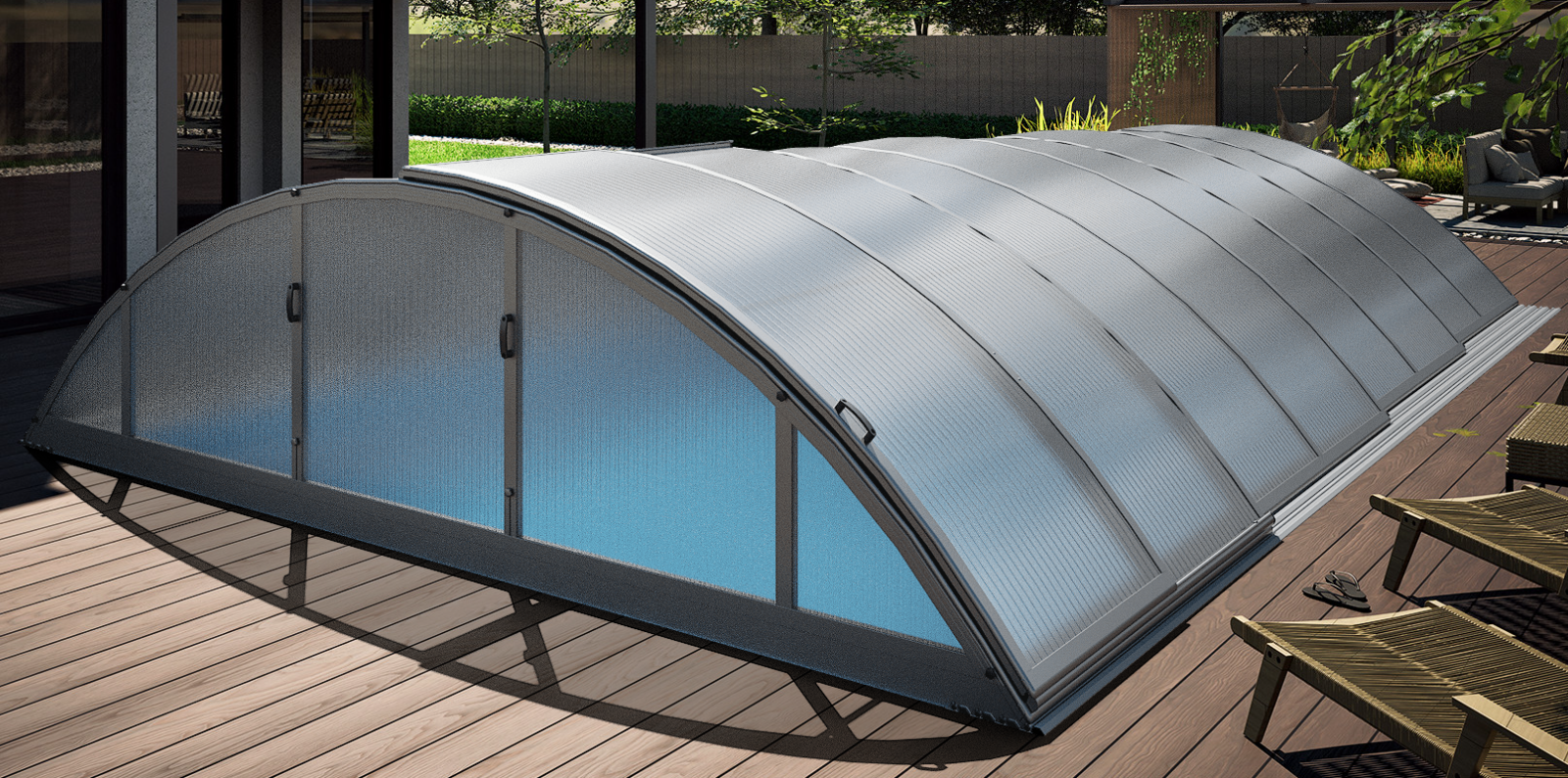 Et pooloverdækning med ekstra stærke profiler på 55x40 mm, kombineret med enten 8 mm klar kanalplast eller 4 mm klarplast, udgør en robust og holdbar løsning...
